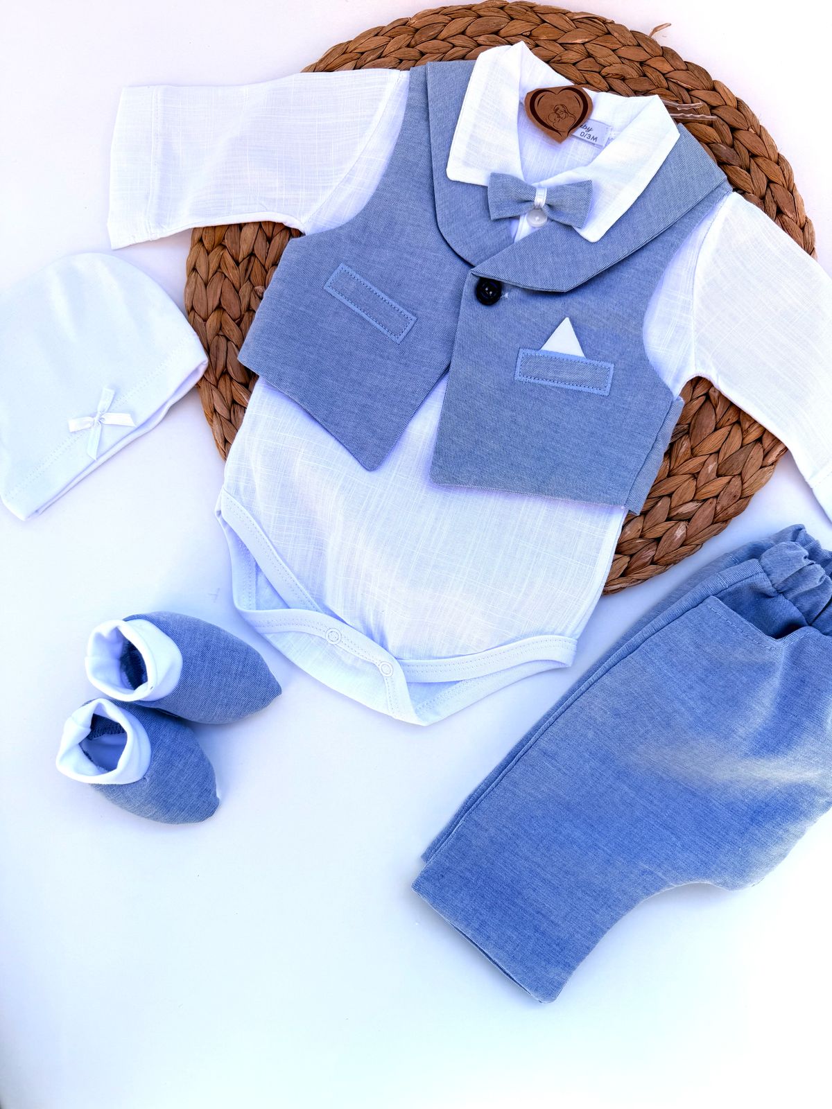 Ensemble Naissance Garçon Lin 4 Pièces avec chaussons bleu – Raffinement et Confort