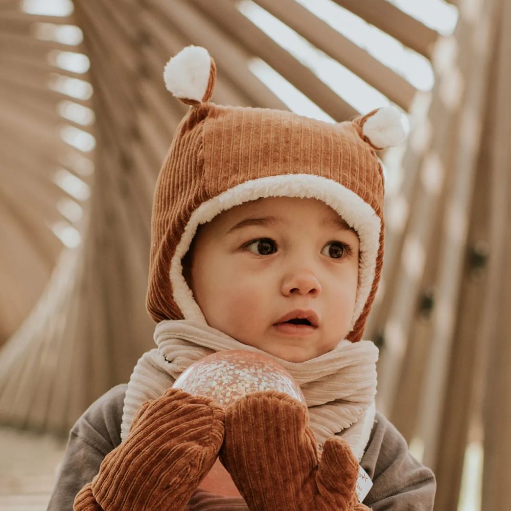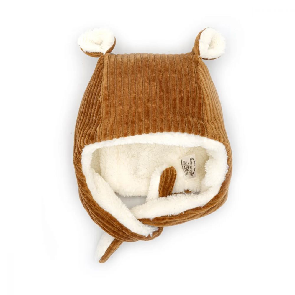 Joli bonnet en velours, doublé. Idéal pour bien couvrir bébé en hiver.