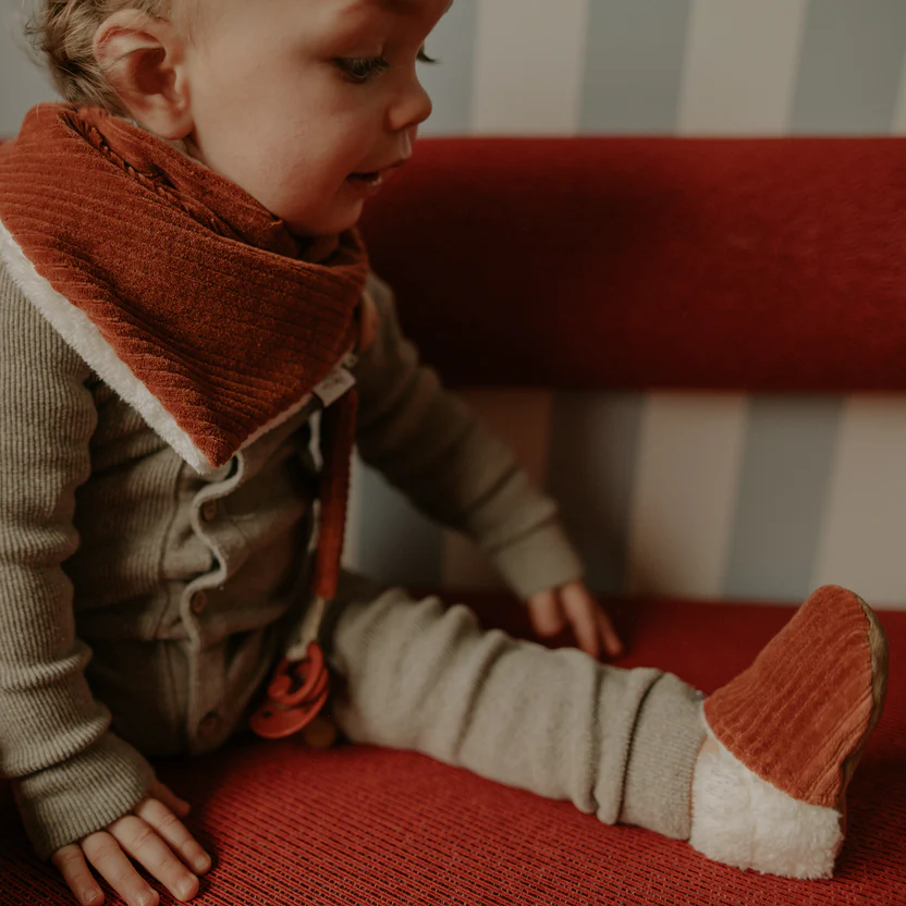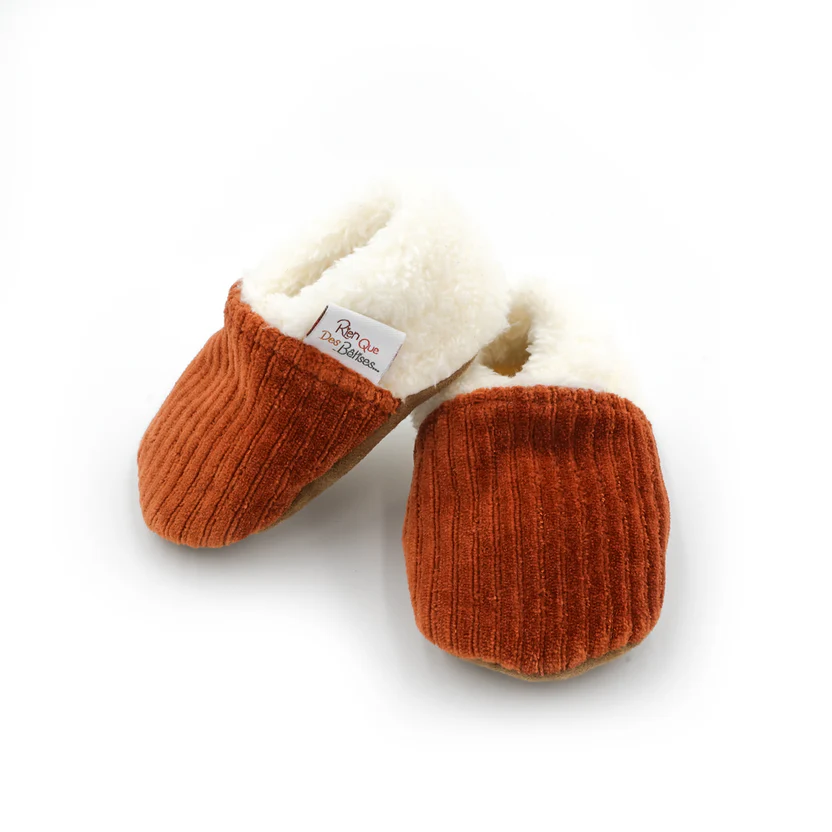 Découvrez les chaussons en velours paprika de la marque RIEN QUE DES BETISES, confectionnés entièrement à la main dans le nord de la France à partir de matières nobles et sans substances chimiques. Ces chaussons côtelés sont idéaux pour garder les petits pieds de votre bébé au chaud et l'accompagner dans ses premiers pas ! Retrouvez la marque RIEN QUE DES BETISES chez Bonnie Bonnie !