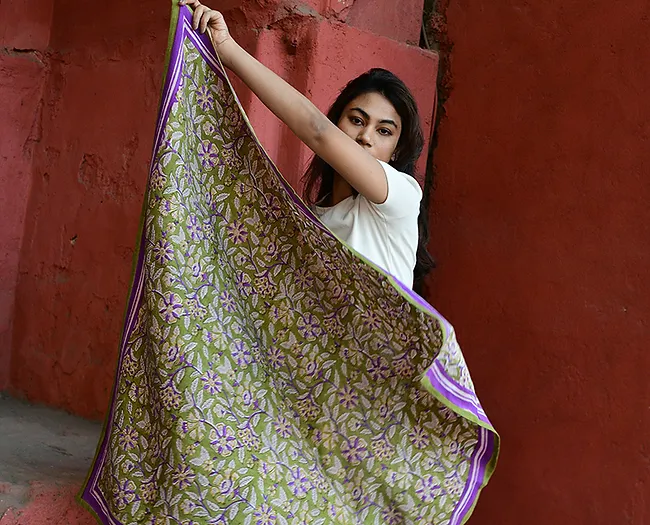 Le grand foulard CARTHAGE Kaki en blockprint indien de chez byzantine apportera une touche d’élégance à toutes vos tenues, qu’elles soient décontractées ou plus habillées.