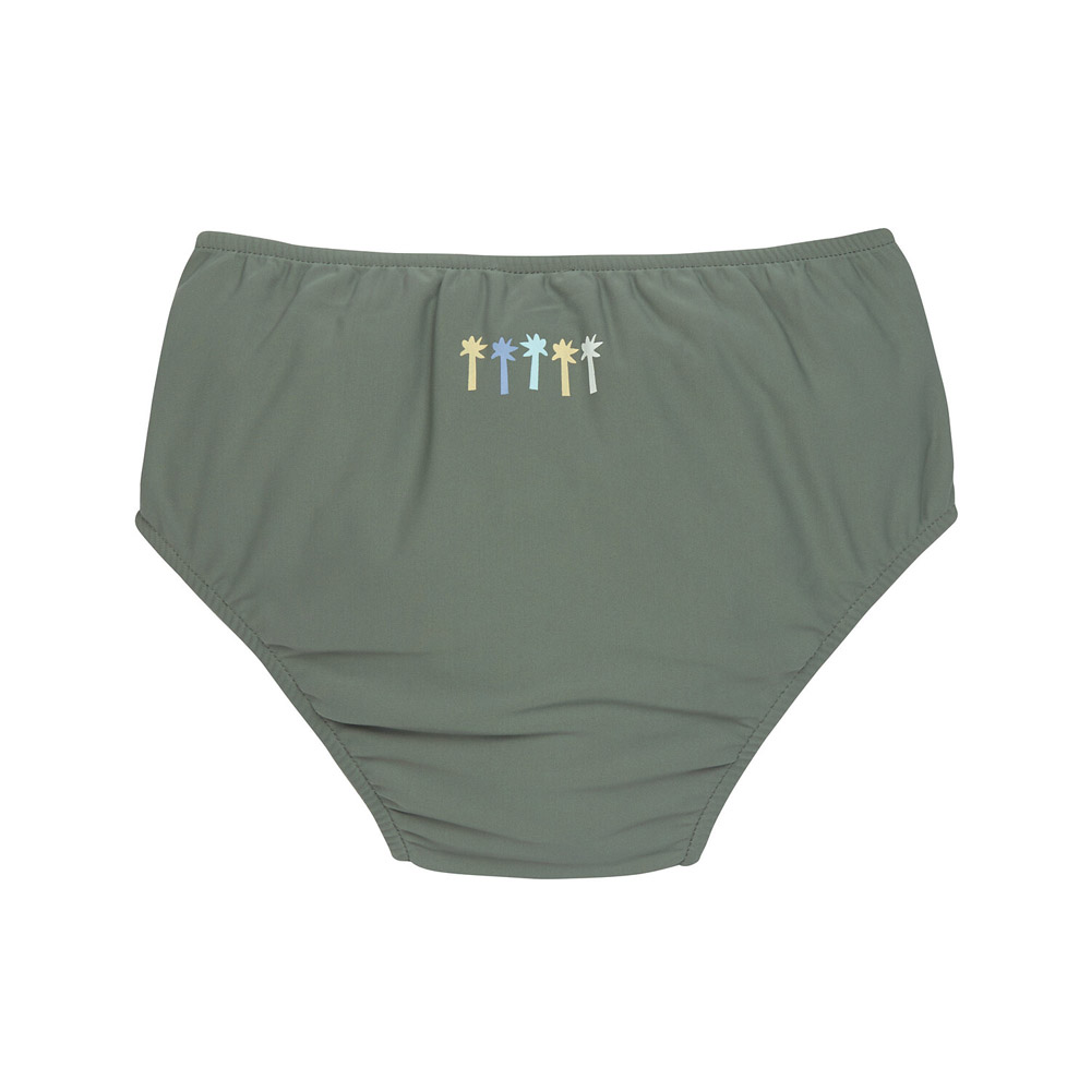 Maillot anti-fuite LÄSSIG olive foncé, idéal pour bébé à la plage ou à la piscine.