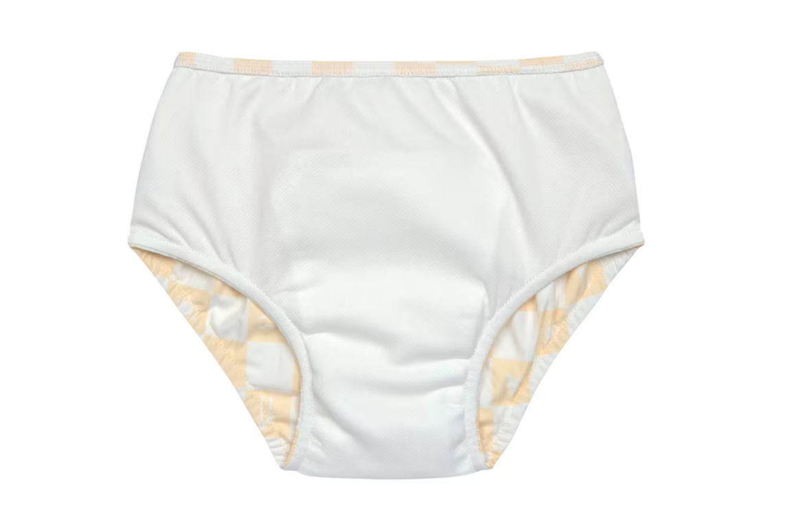 Maillot de bain couche LÄSSIG au motif damier vanille, doux, absorbant et éco-conçu pour les bébés nageurs. Chez Bonnie Bonnie.
