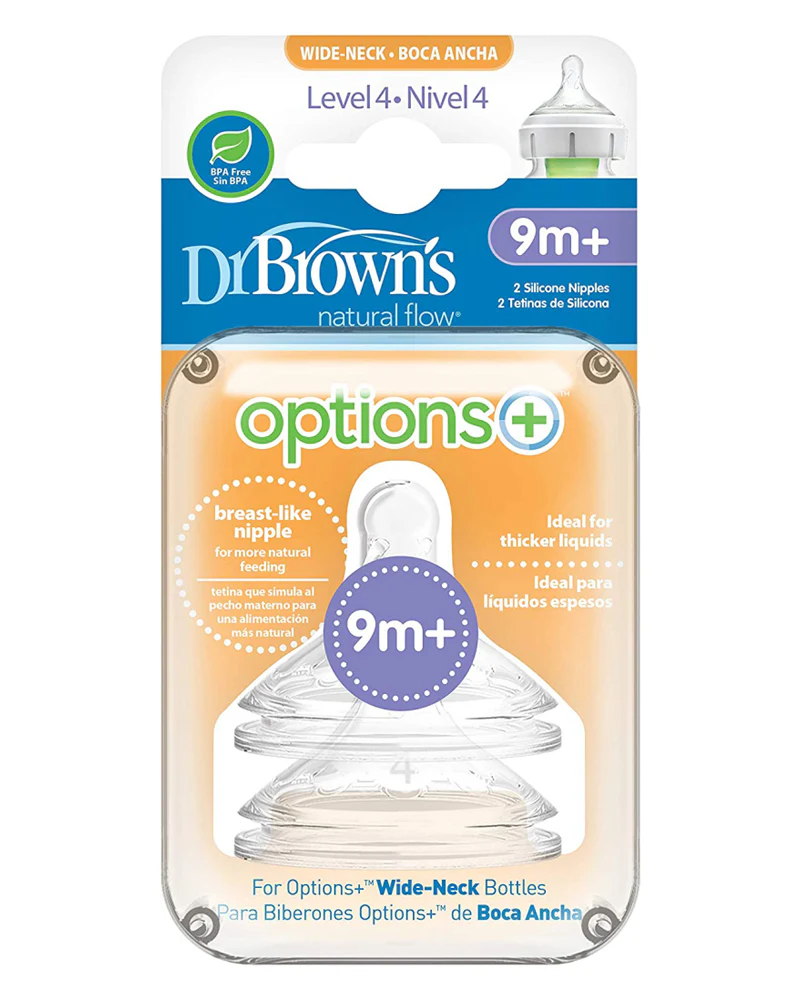 La tétine à col large Dr Brown’s Natural Flow Options+ Level 4 de conception unique est une tétine à débit moyen-rapide, idéale pour les bébés plus âgés qui sont des pros de l’alimentation au biberon.