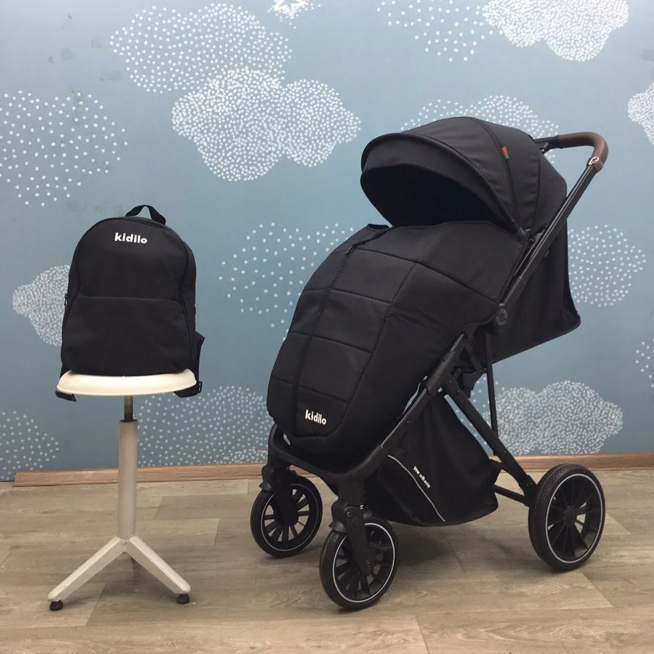 La poussette réversible valise kidilo + sac à dos pour maman + couvre-jambe de la marque Kidilo chez Allobebe est une poussette multifonctionnelle qui comprend un sac pour ranger les affaires personnelles et un couvre-jambe pour protéger bébé des intempéries.
