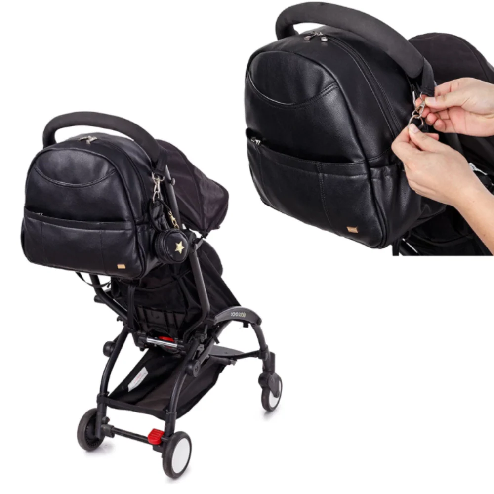 Caractéristiques : • 9 compartiments • Un rangement tétine • S’accroche facilement à la poussette • Sangles poussette offertes • Cuir vegan • Dimensions : H32 x L34 x 14 • Couleur : Cuir jaune pastel • Entretien : Lavage à la main avec une éponge douce.