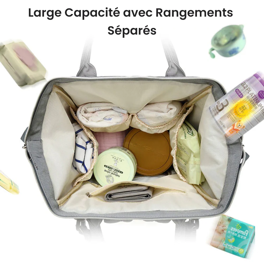Le sac à dos à langer possède 11 compartiments pour faciliter le quotidien des jeunes parents. À l’intérieur, de grandes pochettes élastiquées peuvent accueillir les couches, vêtements et autres affaires indispensables de votre enfant. A l’extérieur, vous trouverez 5 rangements, dont une poche isotherme zippée, un porte bouteille et une pochette lingette intelligente.
