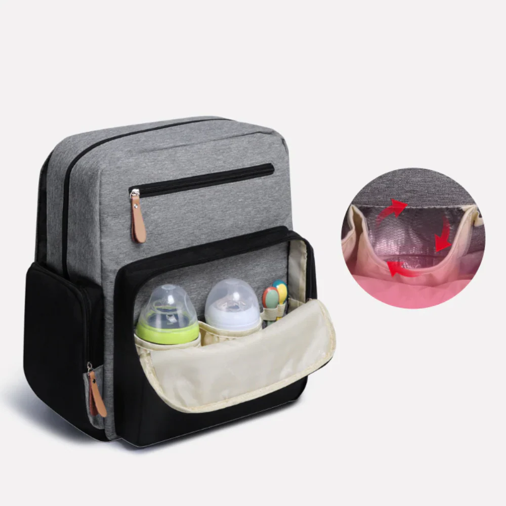 Ce sac à langer à dos dispose de 14 rangements organisés pour faciliter le quotidien des jeunes parents. À l’intérieur, un grand compartiment et plusieurs pochettes peuvent accueillir les couches, vêtements, pot de lait, petits pots, lotions et autres articles indispensables pour votre enfant. À l’extérieur, 6 rangements supplémentaires offrent encore plus de rangement et de flexibilité. Parmi ces rangements, il y a deux poches isothermes zippées pouvant contenir jusqu’à quatre biberons chauds pendant jusqu’à trois heures. Un harnais de poussette inclus permet le transport mains-libres.