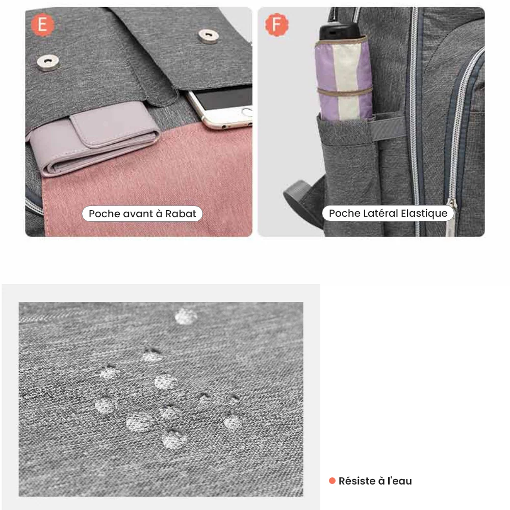 Le sac à dos à langer est facile à transporter et dispose de deux poignées et deux anses épaule réglables pour un transport main-libre. Il est également équipé d’un port USB pour brancher un chauffe-biberon et d’une pochette extérieure isotherme pour garder les biberons au chaud.