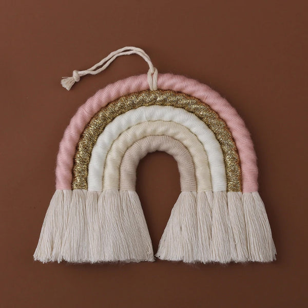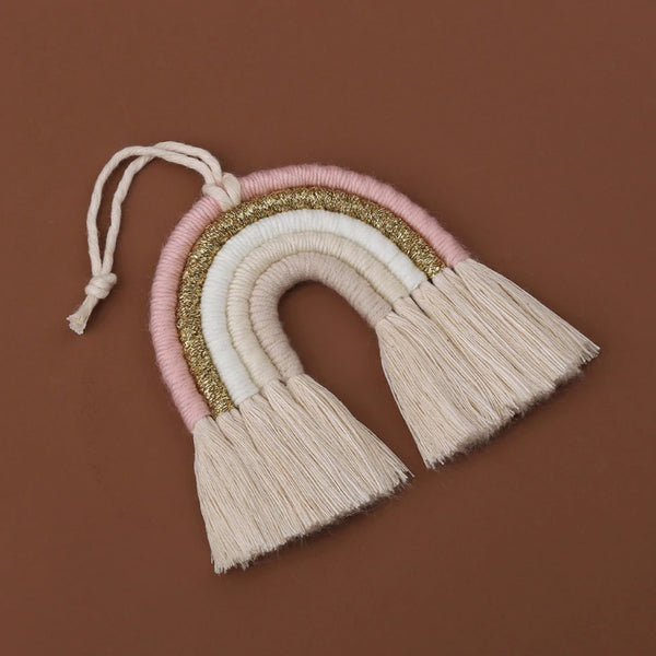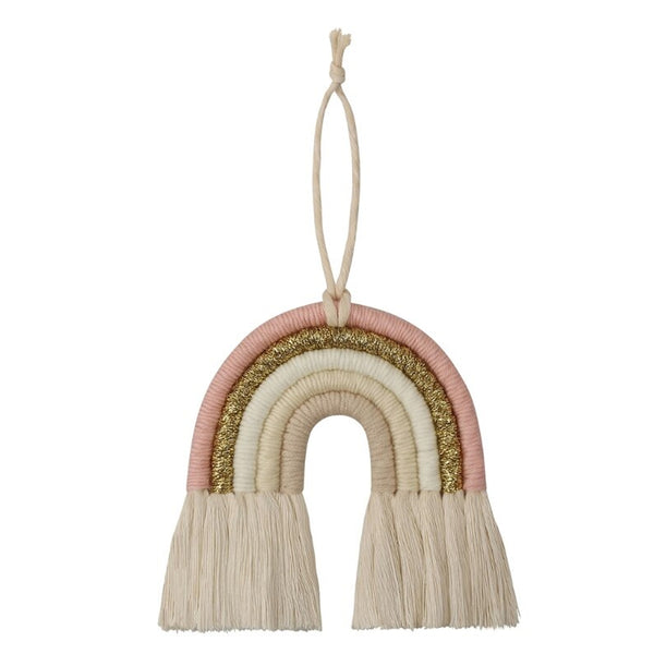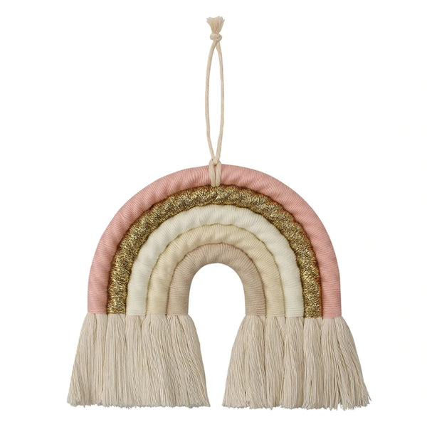 Suspension arc-en-ciel en macramé – Rose et doré est parfait pour offrir une touche de couleur et de douceur à la chambre de bébé. Matières : coton et macramé, coloris rose et doré, motif doré, pigments alimentaires non toxiques.
